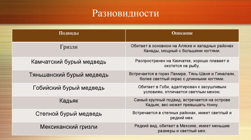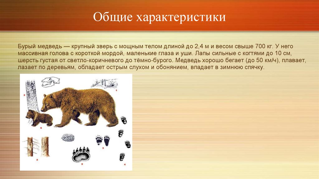 Общие характеристикиБурый медведь — крупный зверь с мощным телом длиной до 2,4 м и весом свыше 700 кг. У него