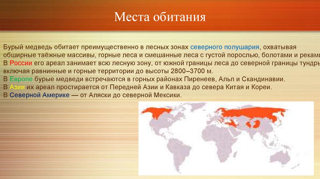 Места обитанияБурый медведь обитает преимущественно в лесных зонах северного полушария, охватывая