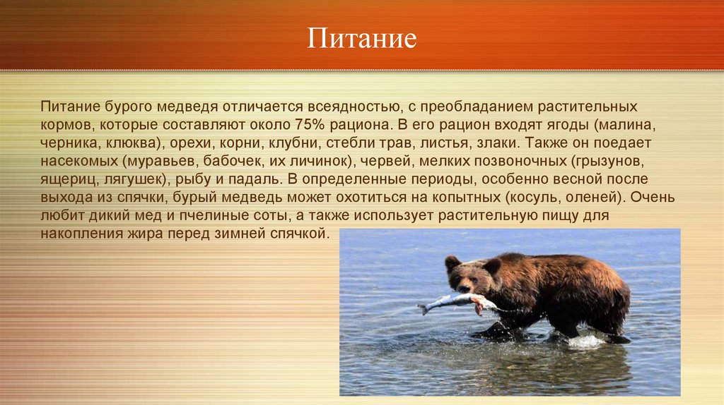 ПитаниеПитание бурого медведя отличается всеядностью, с преобладанием растительных