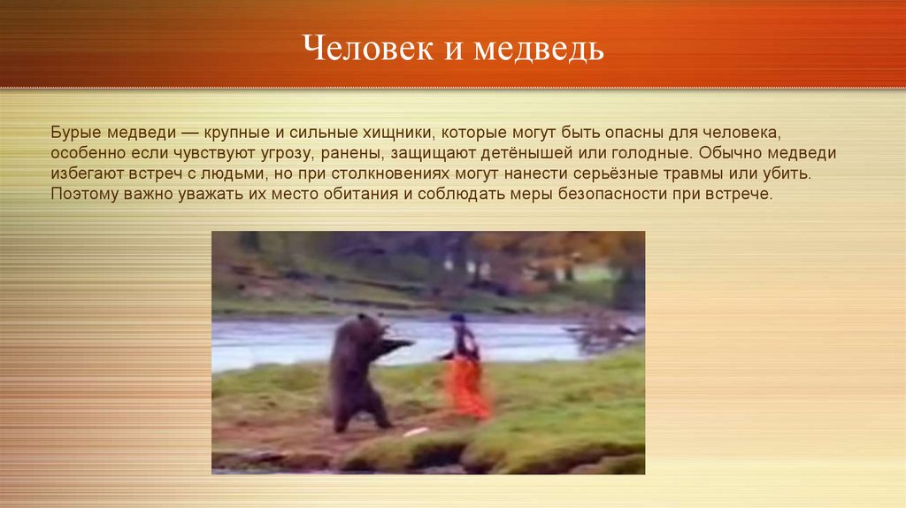 Человек и медведьБурые медведи — крупные и сильные хищники, которые могут быть опасны для человека,