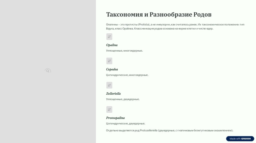 Таксономия и Разнообразие РодовОпалины — это протисты (Protista), а не инфузории, как считалось ранее. Их таксономическое положение: тип
