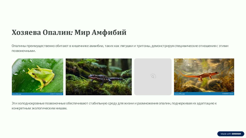 Хозяева Опалин: Мир АмфибийОпалины преимущественно обитают в кишечнике амфибий, таких как лягушки и тритоны, демонстрируя специфические отношения с этими