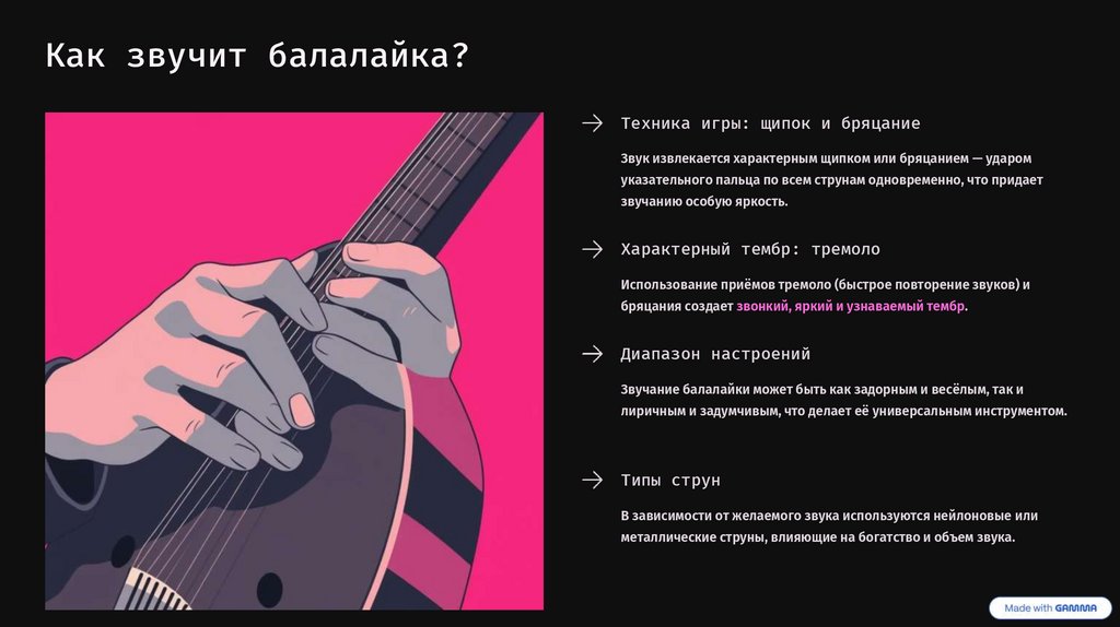 бряцания создает звонкий, яркий и узнаваемый тембр.