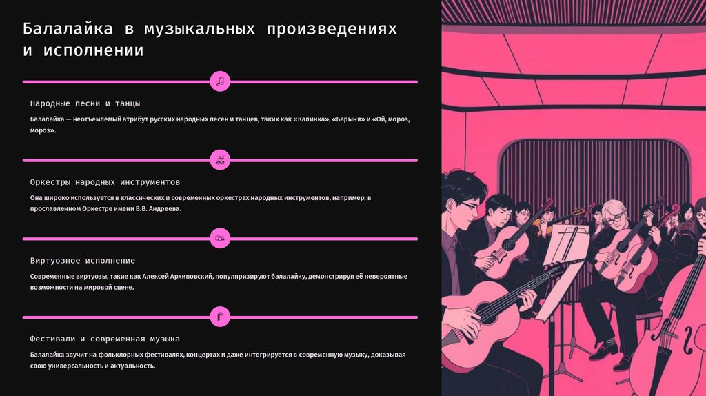 Балалайка звучит на фольклорных фестивалях, концертах и даже интегрируется в современную музыку, доказывая