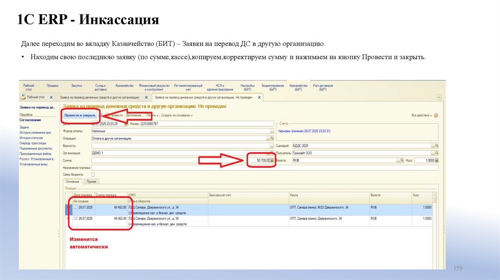 1С ERP - ИнкассацияДалее переходим во вкладку Казначейство (БИТ) – Заявки на перевод ДС в другую организацию.