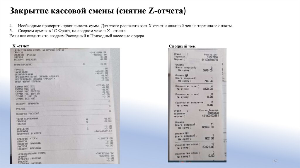Закрытие кассовой смены (снятие Z-отчета)4. Необходимо проверить правильность сумм. Для этого распечатывает X-отчет и сводный чек на терминале оплаты.