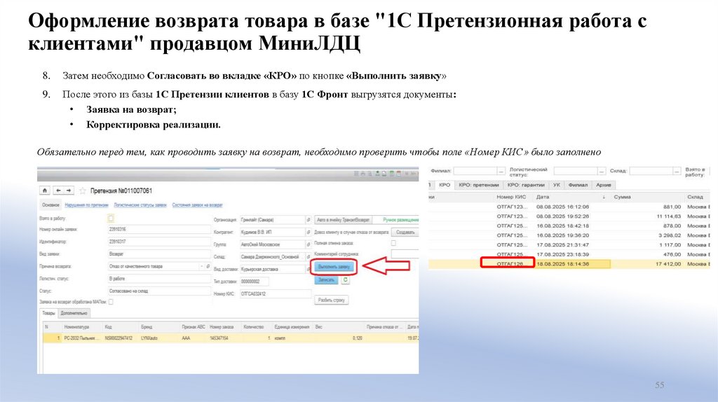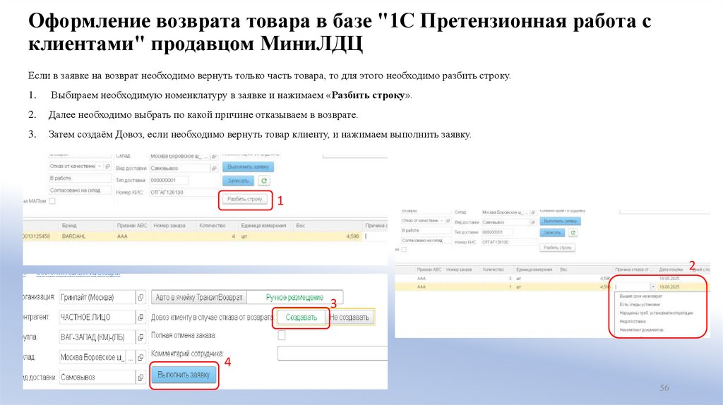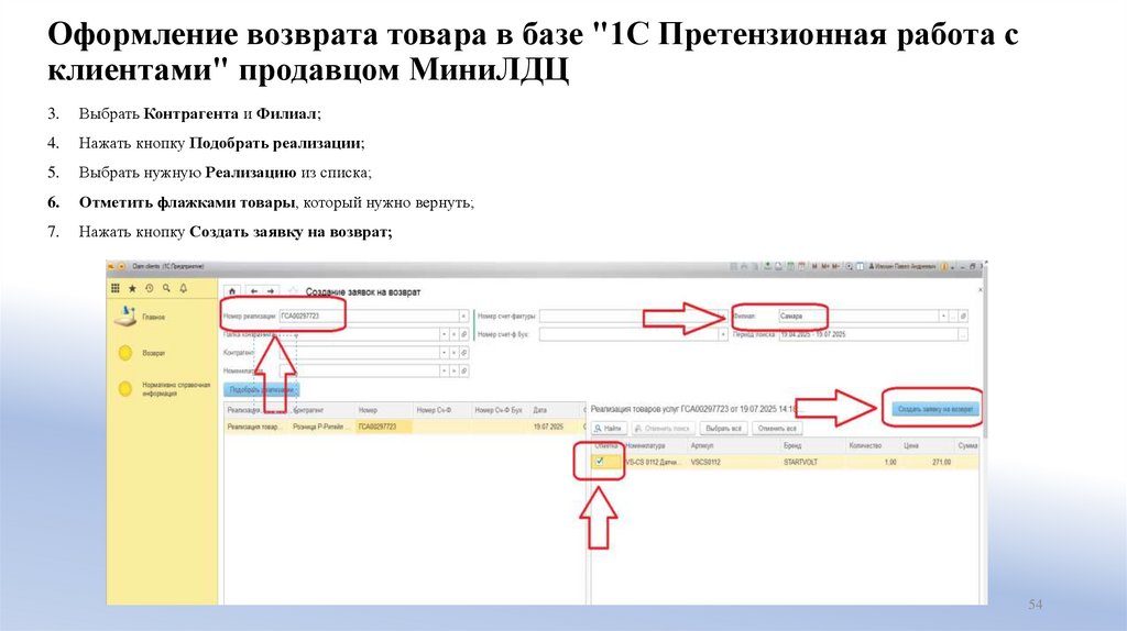 Оформление возврата товара в базе "1С Претензионная работа с клиентами" продавцом МиниЛДЦ………..........53