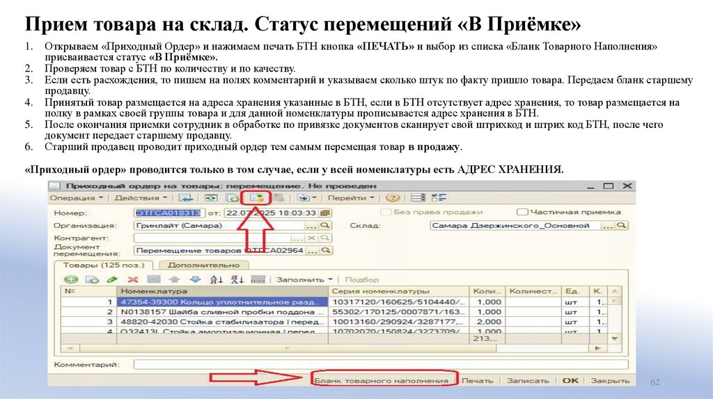 Прием товара на склад. Статус перемещения «В приемке» …………………………………………………………....62