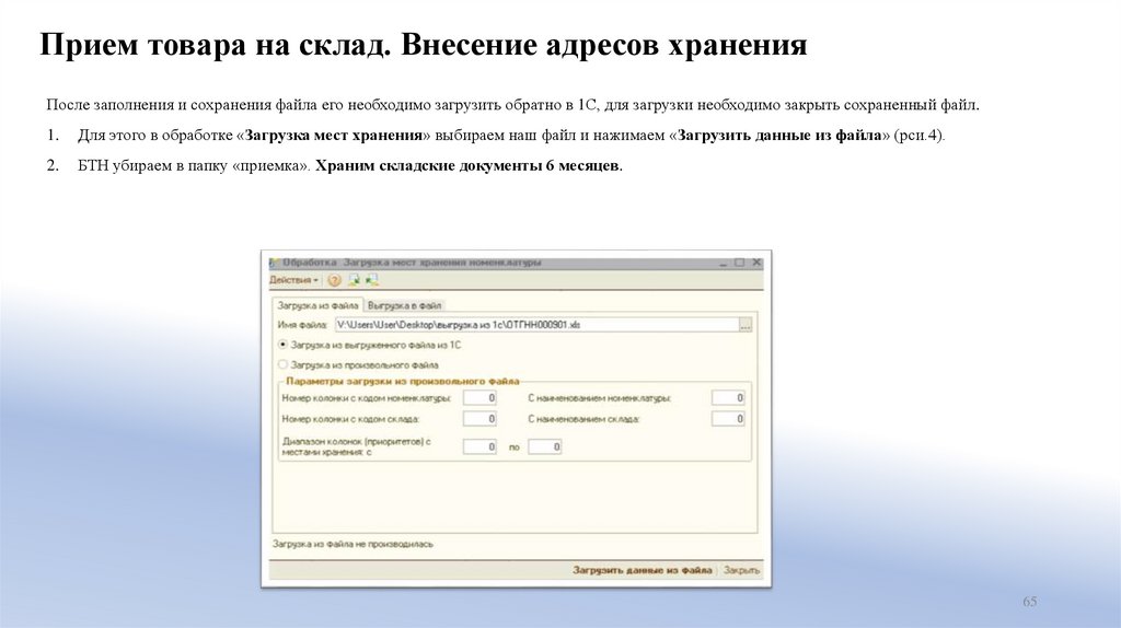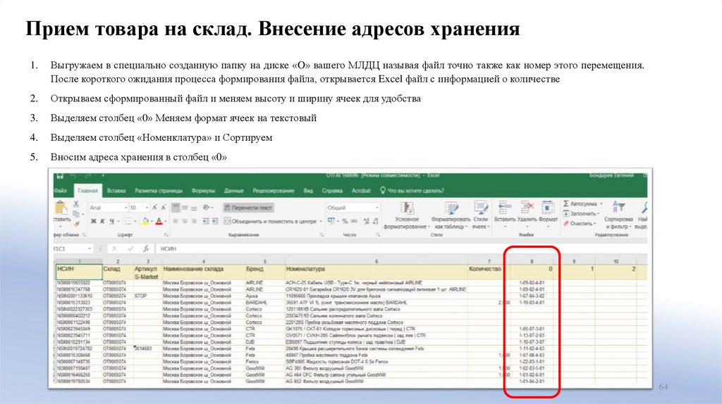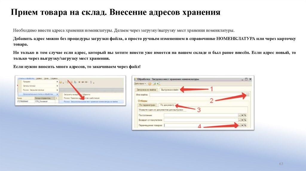 Прием товара на склад. Внесение адресов хранения…………………………………………………………………....63
