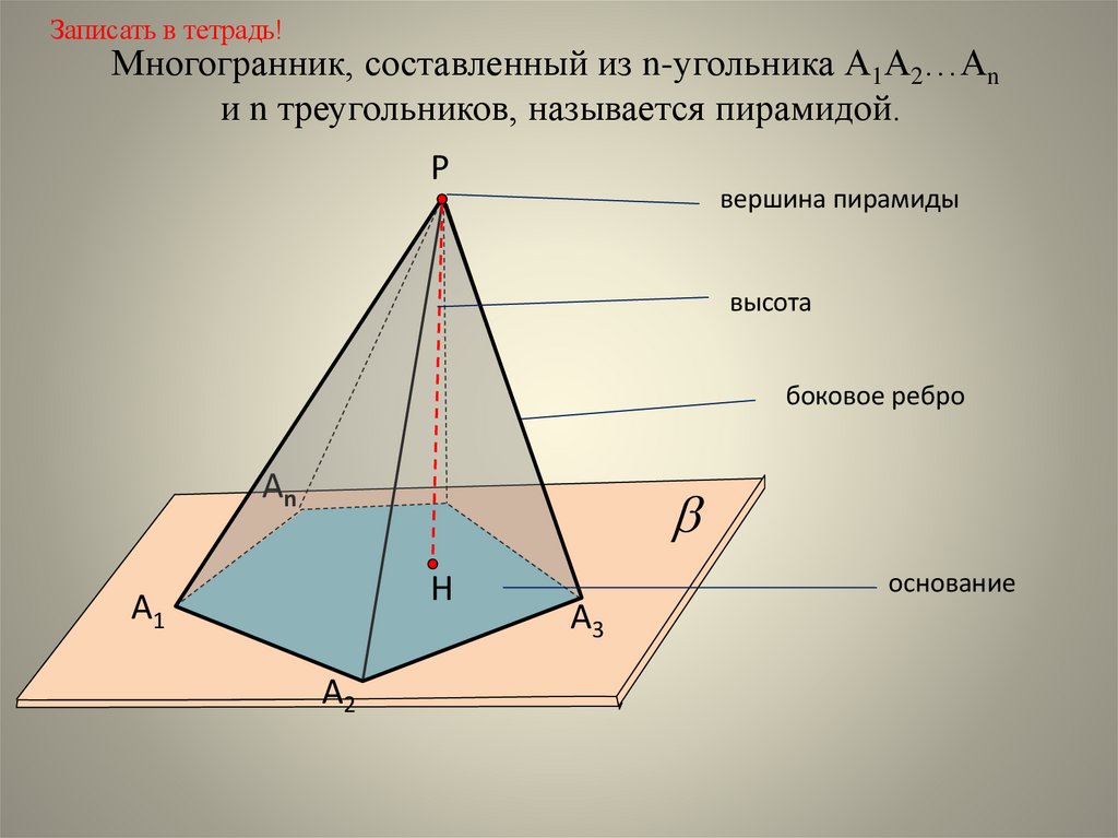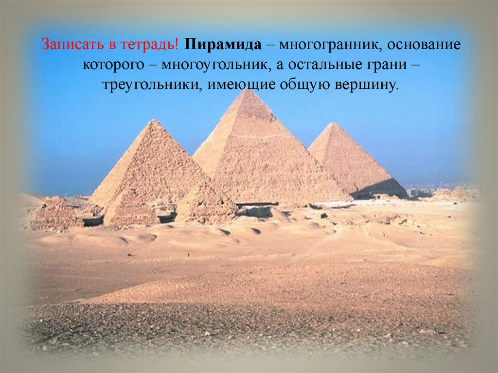 Записать в тетрадь! Пирамида – многогранник, основаниекоторого – многоугольник, а остальные грани –