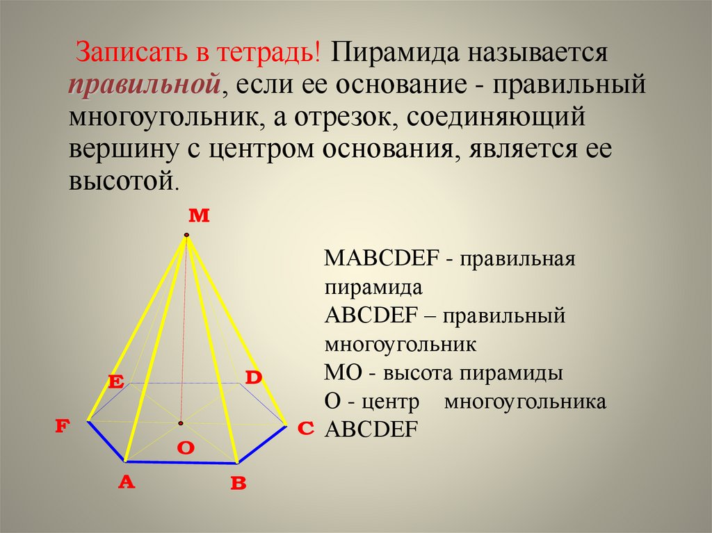 Записать в тетрадь! Пирамида называетсяправильной, если ее основание - правильный