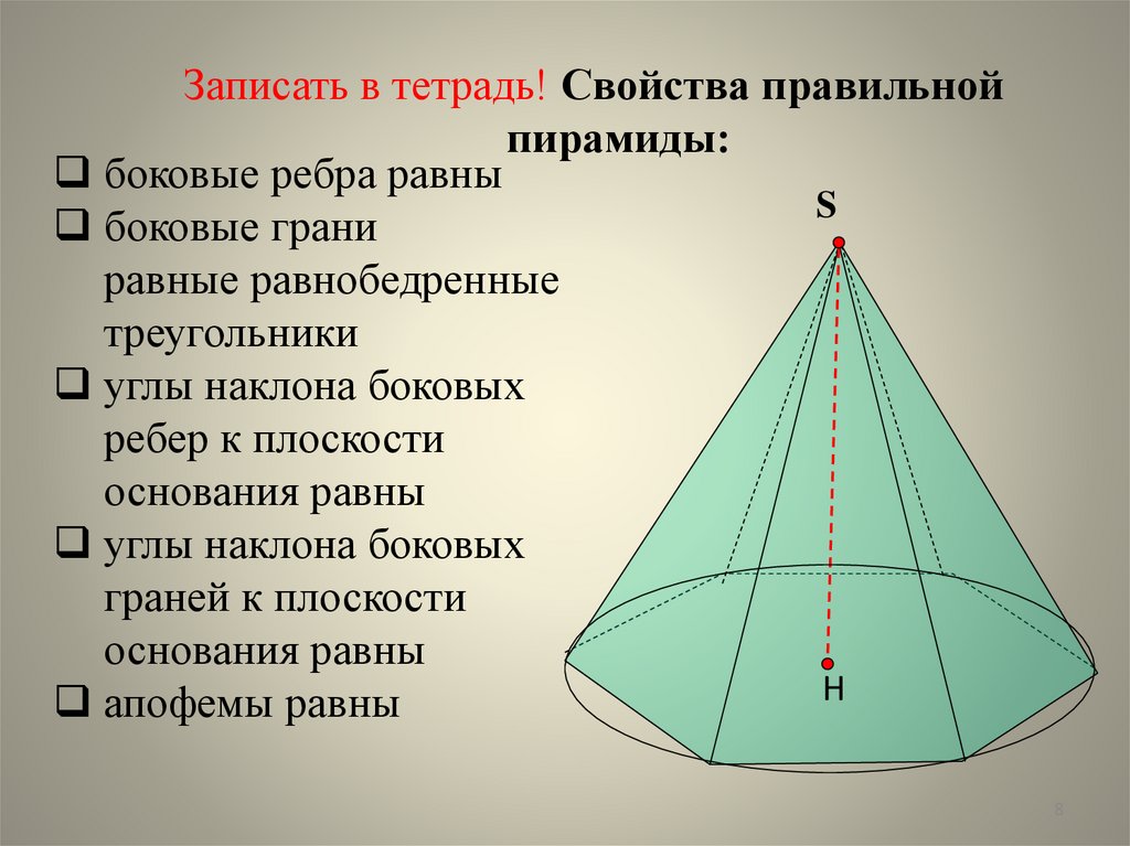 Записать в тетрадь! Свойства правильнойпирамиды: