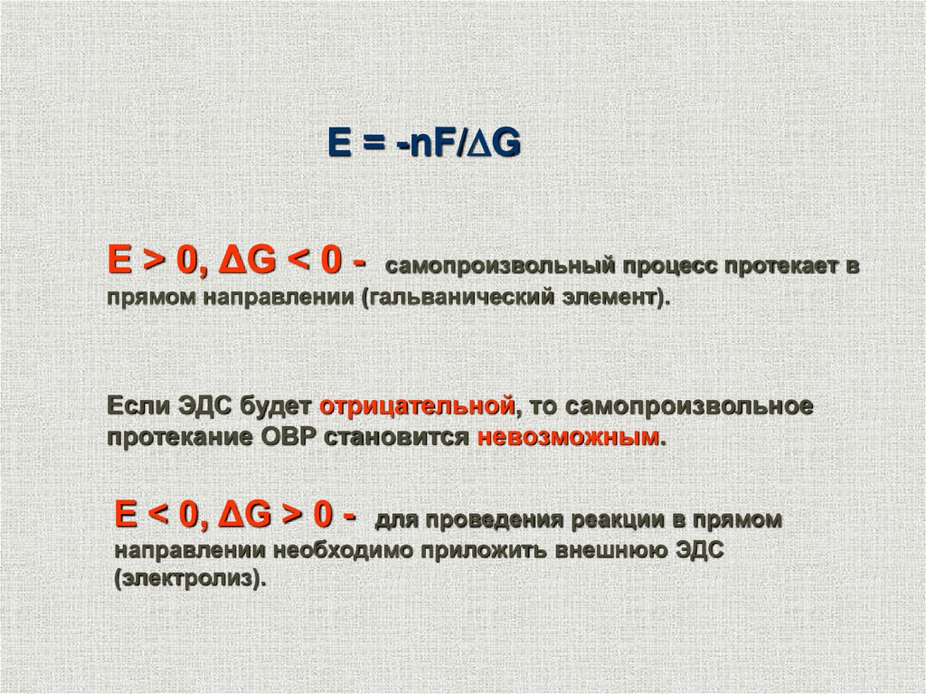 Е = -nF/ GE > 0, ΔG < 0 - самопроизвольный процесс протекает в