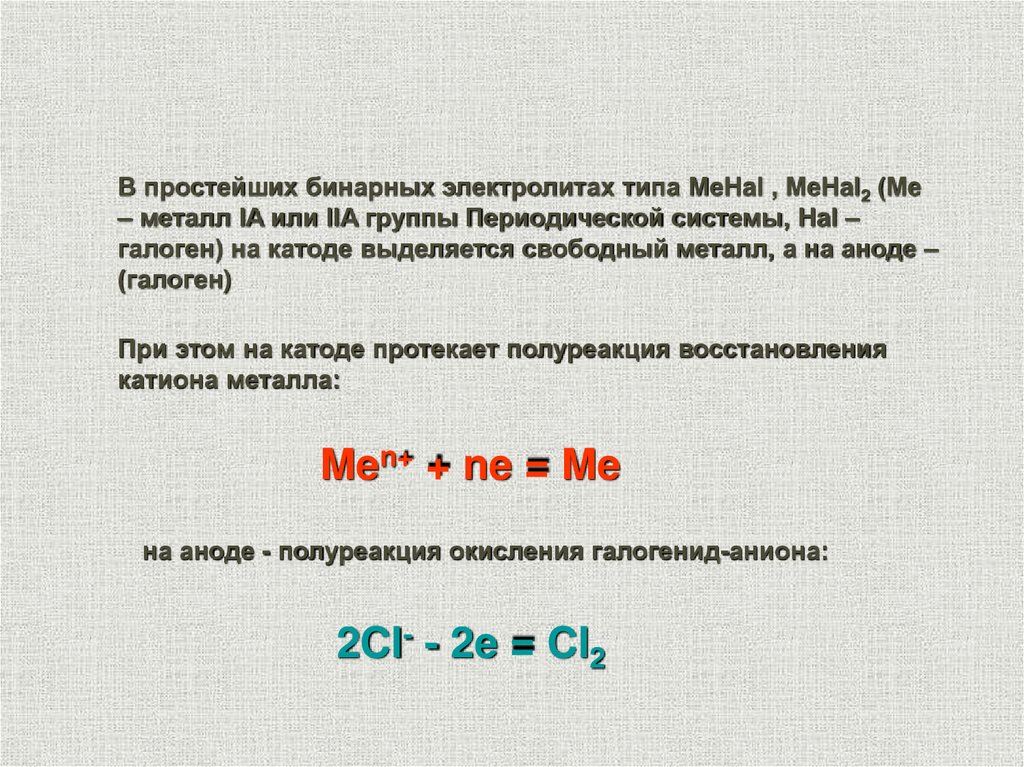 В простейших бинарных электролитах типа MeHal , MeHal2 (Me– металл IA или IIA группы Пеpиодической системы, Hal –