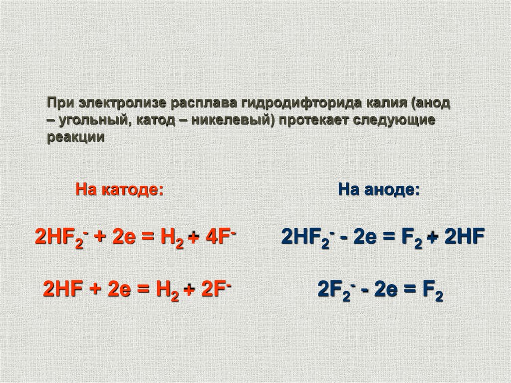 При электролизе расплава гидродифторида калия (анод– угольный, катод – никелевый) протекает следующие