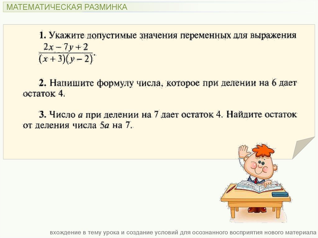 МАТЕМАТИЧЕСКАЯ РАЗМИНКАвхождение в тему урока и создание условий для осознанного восприятия нового материала