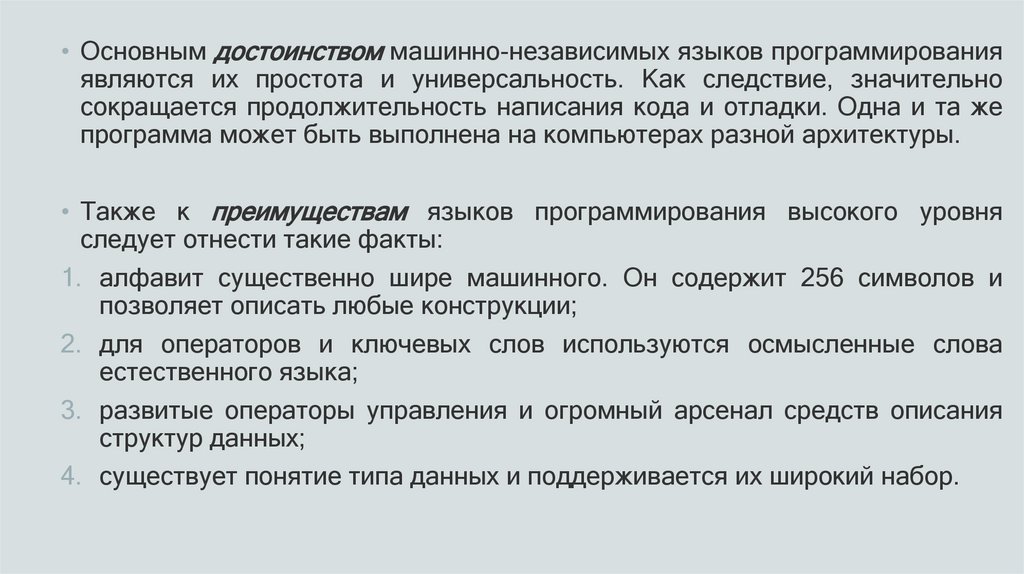 • Основным достоинством машинно-независимых языков программированияявляются их простота и универсальность. Как следствие, значительно