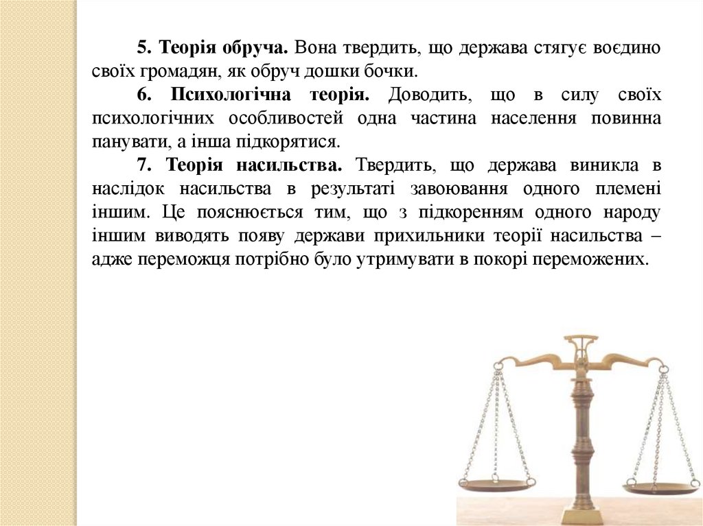 5. Теорія обруча. Вона твердить, що держава стягує воєдиносвоїх громадян, як обруч дошки бочки.