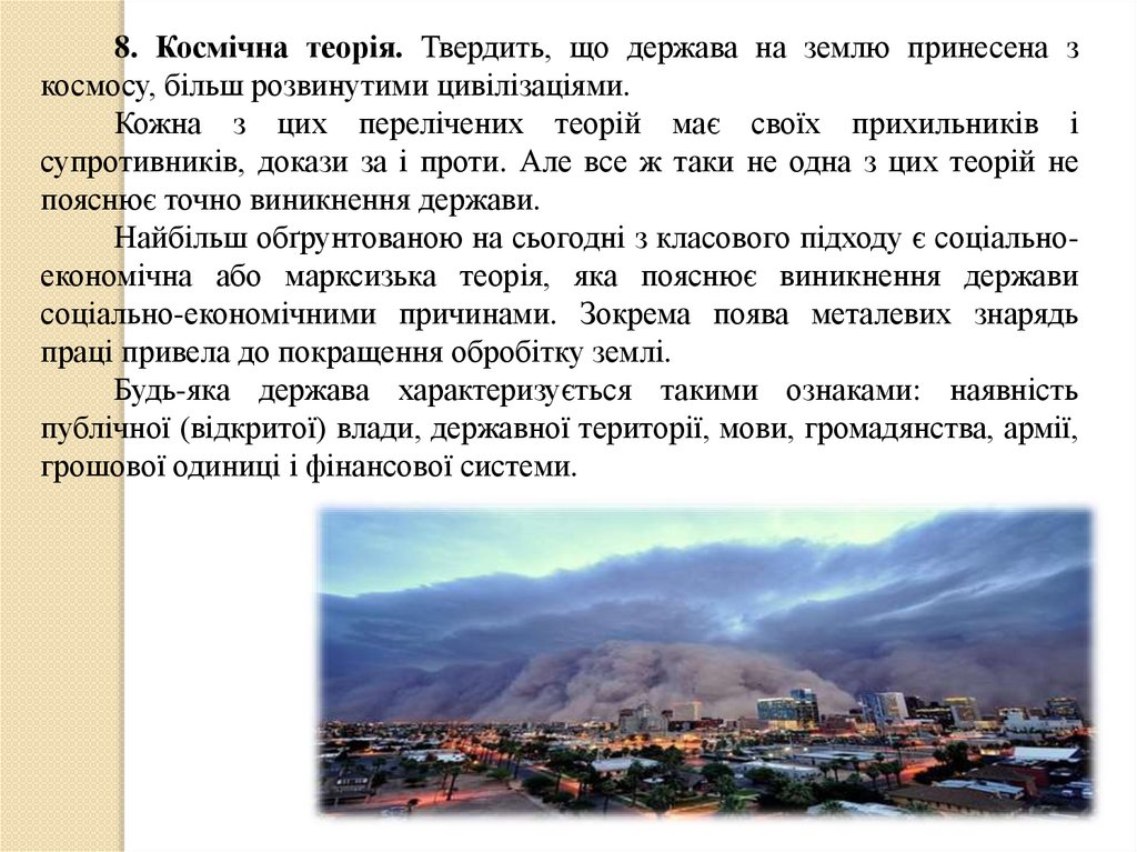 8. Космічна теорія. Твердить, що держава на землю принесена зкосмосу, більш розвинутими цивілізаціями.