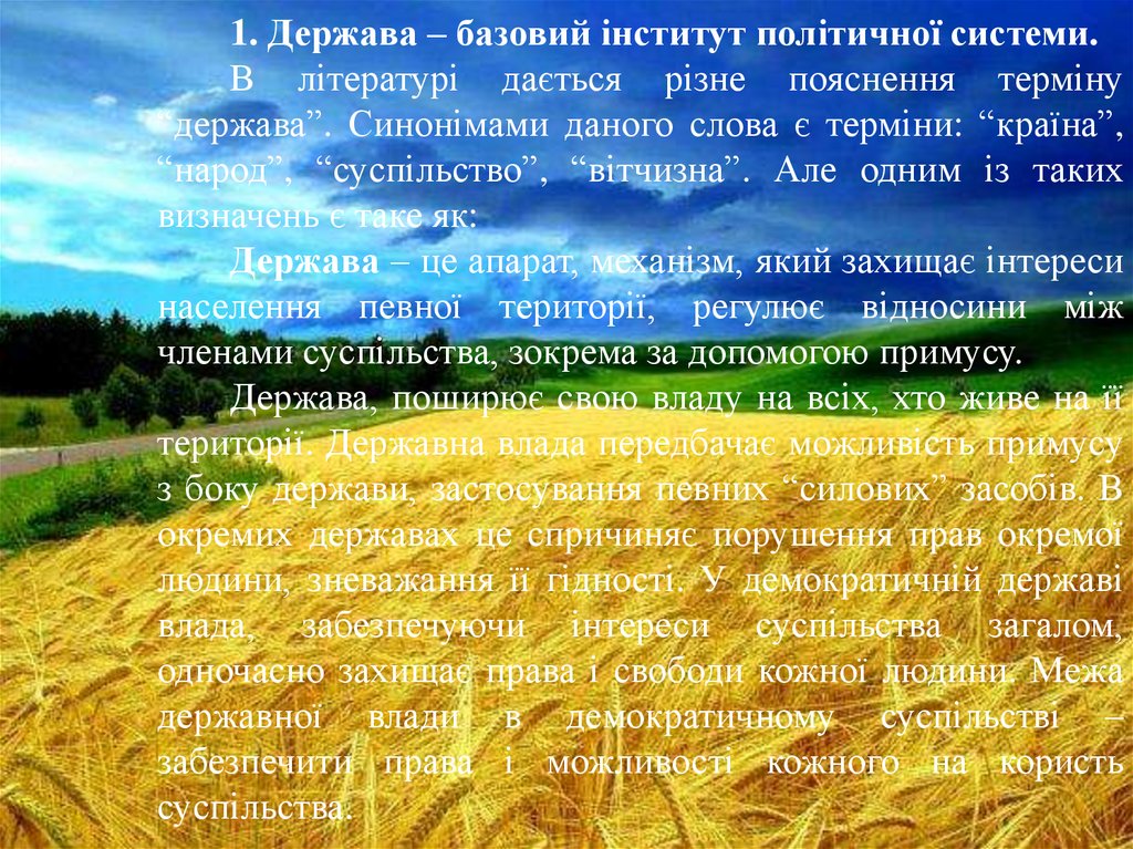 1. Держава – базовий інститут політичної системи.В літературі дається різне пояснення терміну