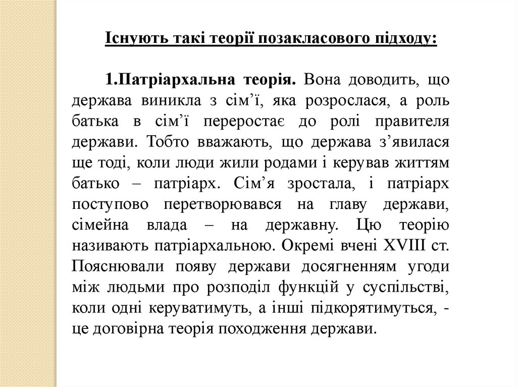 Існують такі теорії позакласового підходу:1.Патріархальна теорія. Вона доводить, що