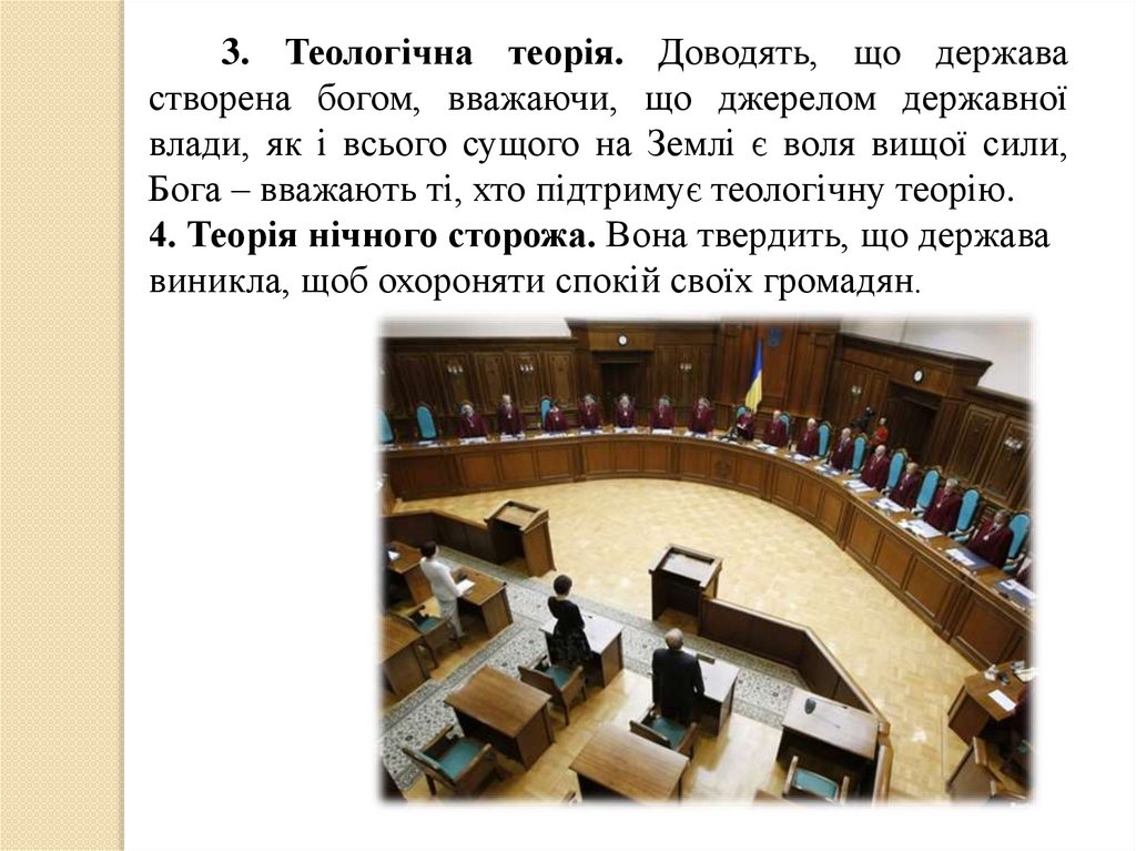 3. Теологічна теорія. Доводять, що державастворена богом, вважаючи, що джерелом державної