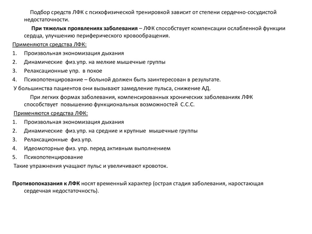 Подбор средств ЛФК с психофизической тренировкой зависит от степени сердечно-сосудистойнедостаточности.