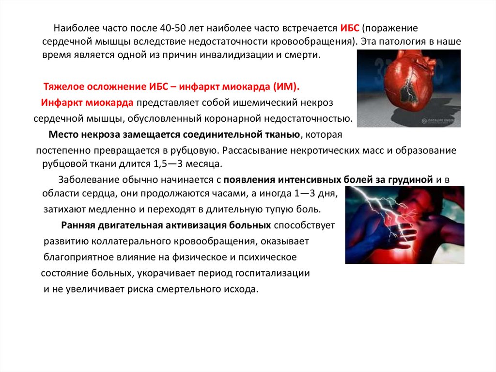 Наиболее часто после 40-50 лет наиболее часто встречается ИБС (поражениесердечной мышцы вследствие недостаточности кровообращения). Эта патология в наше