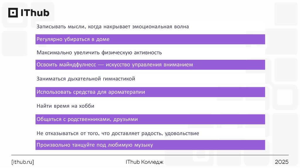 Записывать мысли, когда накрывает эмоциональная волнаРегулярно убираться в доме