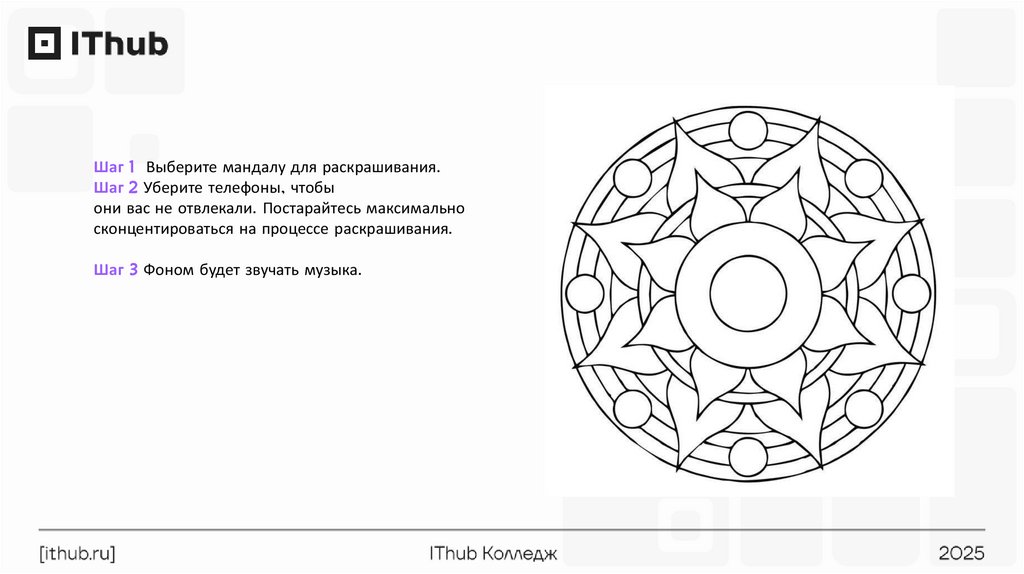 Шаг 1 Выберите мандалу для раскрашивания.Шаг 2 Уберите телефоны, чтобы