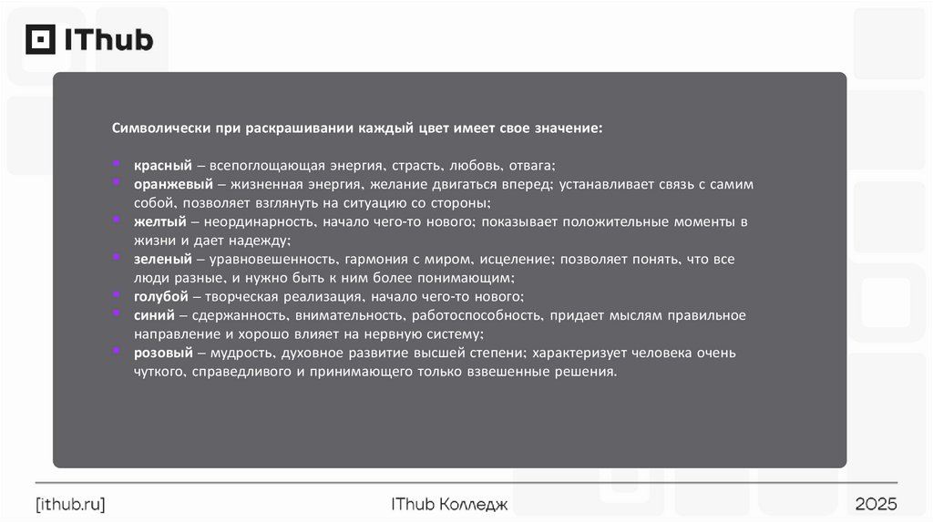 Символически при раскрашивании каждый цвет имеет свое значение:красный – всепоглощающая энергия, страсть, любовь, отвага;