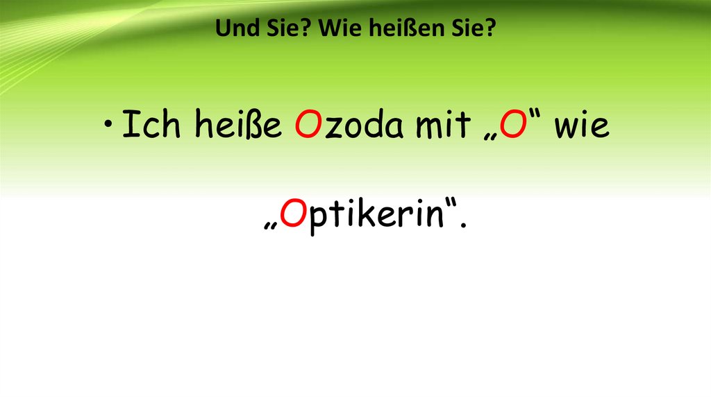 Und Sie? Wie heißen Sie?• Ich heiße Ozoda mit „O“ wie