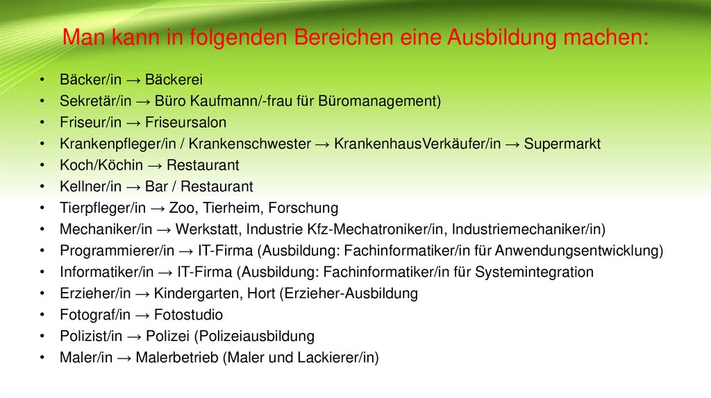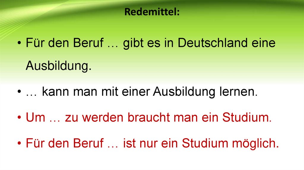 Redemittel:• Für den Beruf … gibt es in Deutschland eine