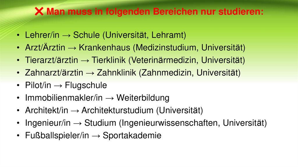 ❌ Man muss in folgenden Bereichen nur studieren:• Lehrer/in → Schule (Universität, Lehramt)