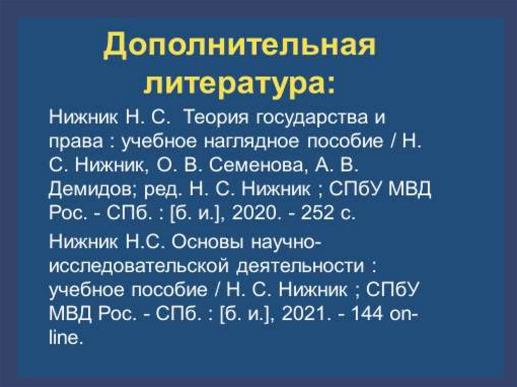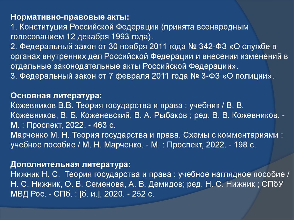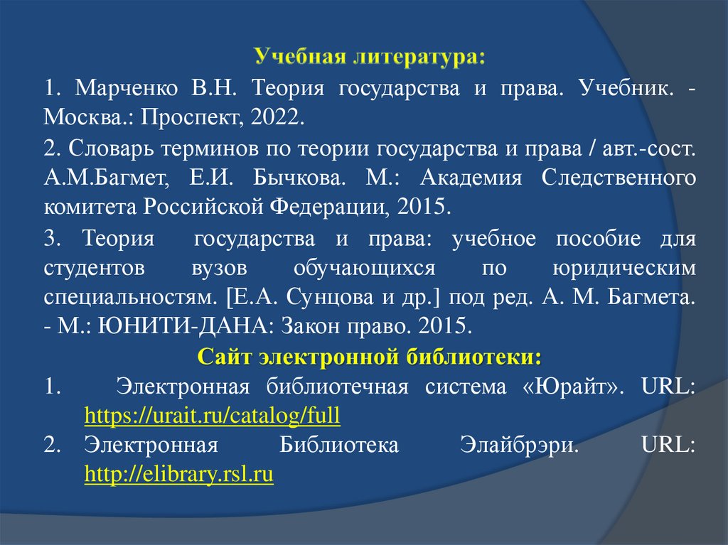 1. Марченко В.Н. Теория государства и права. Учебник. Москва.: Проспект, 2022.2. Словарь терминов по теории государства и права / авт.-сост.