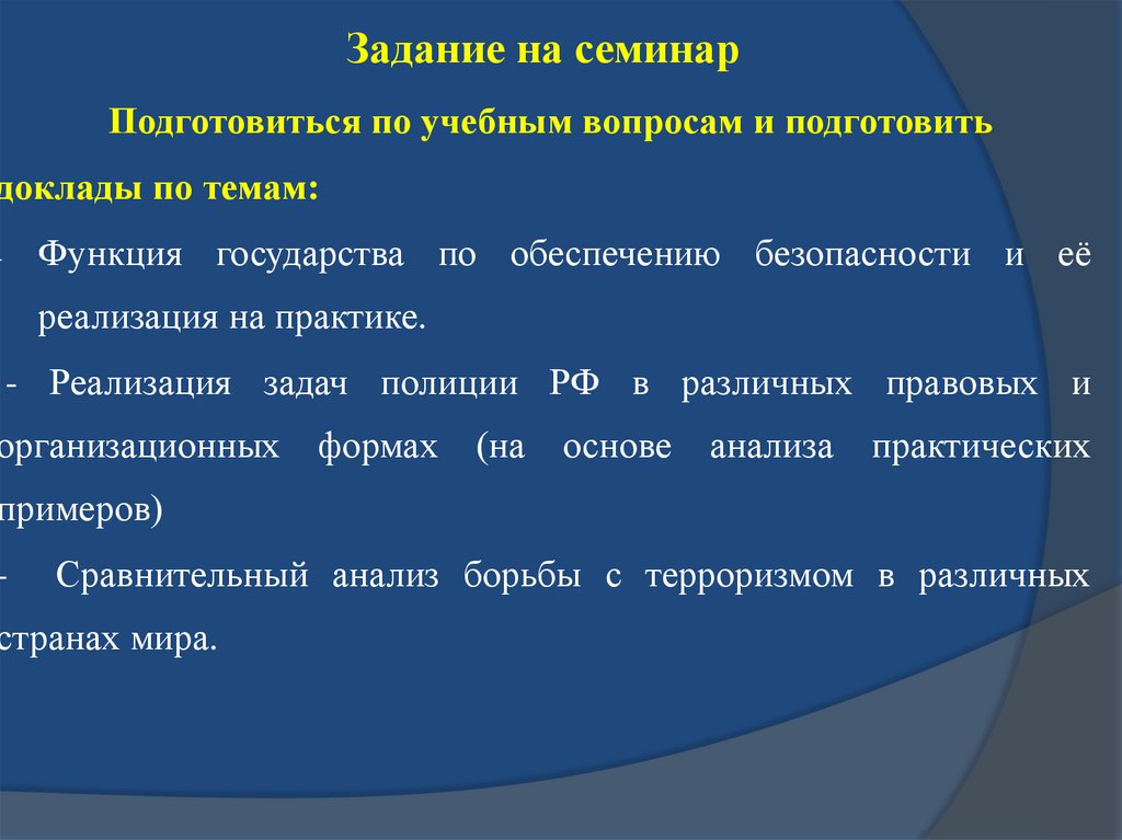 Задание на семинарПодготовиться по учебным вопросам и подготовить