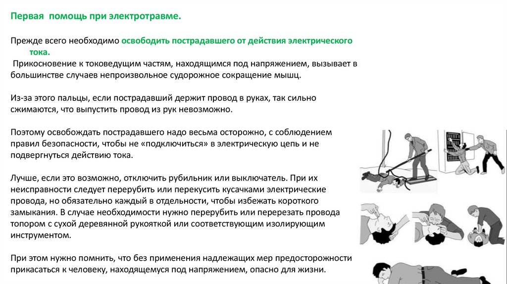 Первая помощь при электротравме.Прежде всего необходимо освободить пострадавшего от действия электрического