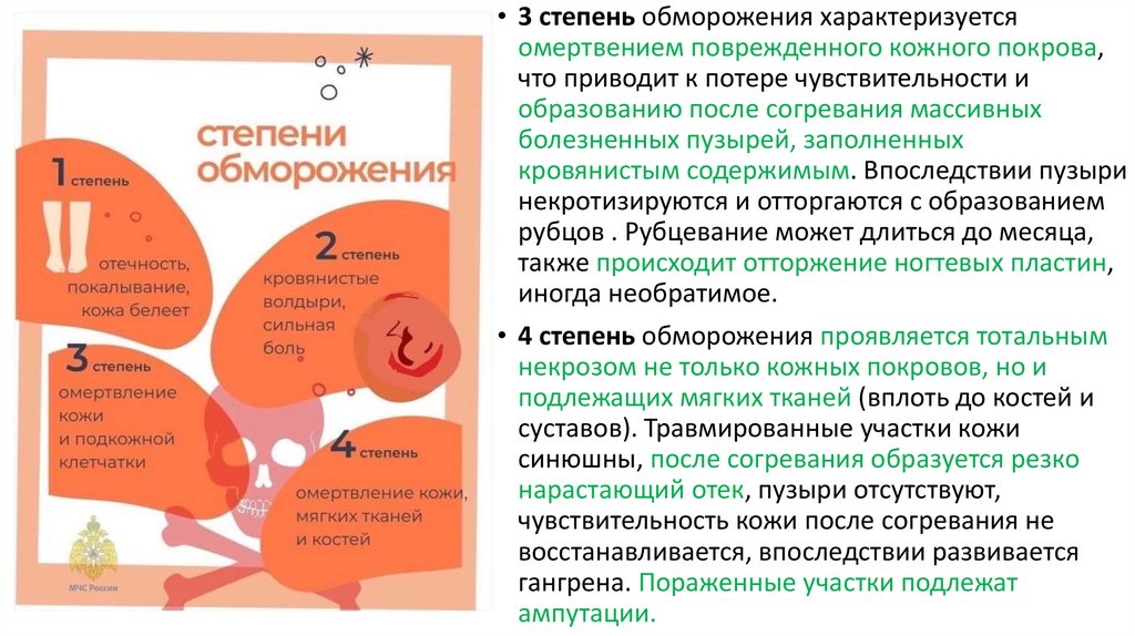• 3 степень обморожения характеризуетсяомертвением поврежденного кожного покрова,