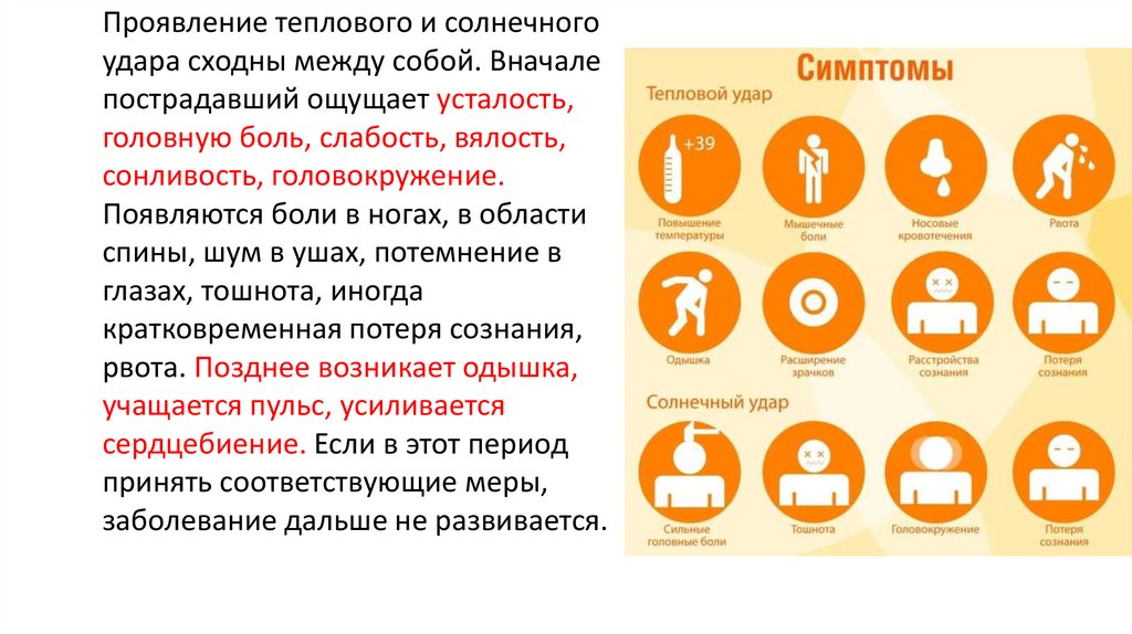 Проявление теплового и солнечногоудара сходны между собой. Вначале