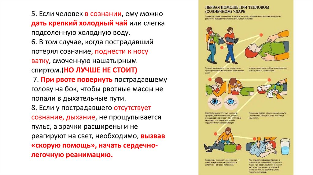 5. Если человек в сознании, ему можнодать крепкий холодный чай или слегка