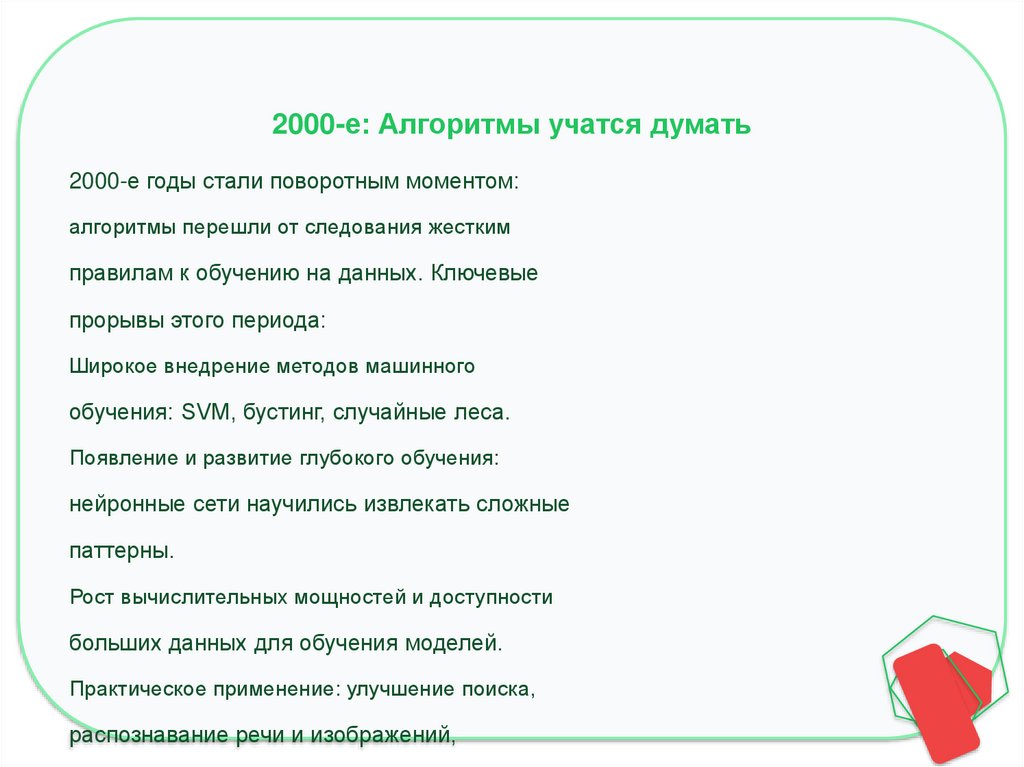 2000-е: Алгоритмы учатся думать2000-е годы стали поворотным моментом:
