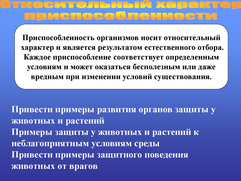 Приспособленность организмов носит относительныйхарактер и является результатом естественного отбора.