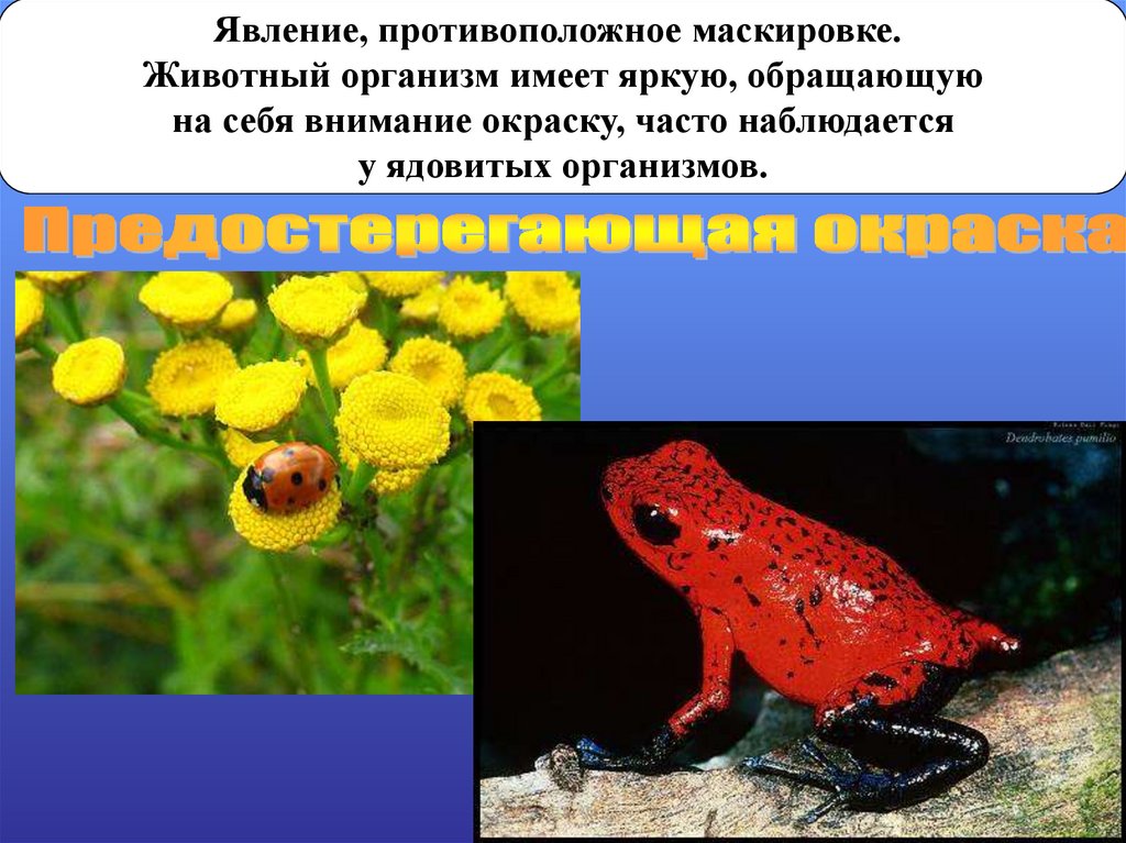 Явление, противоположное маскировке.Животный организм имеет яркую, обращающую