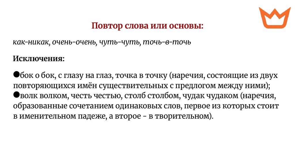 Повтор слова или основы:как-никак, очень-очень, чуть-чуть, точь-в-точь