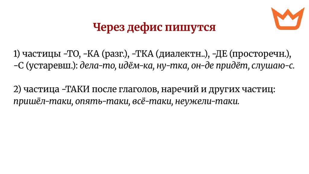 Через дефис пишутся1) частицы -ТО, -КА (разг.), -ТКА (диалектн..), -ДЕ (просторечн.),
