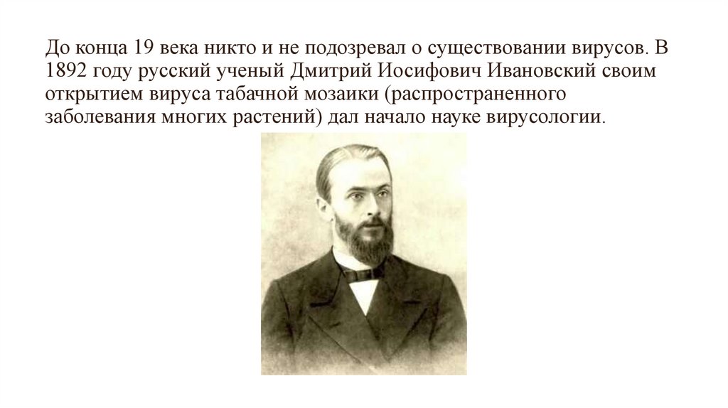 До конца 19 века никто и не подозревал о существовании вирусов. В1892 году русский ученый Дмитрий Иосифович Ивановский своим