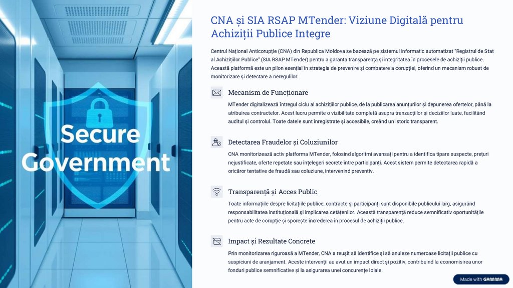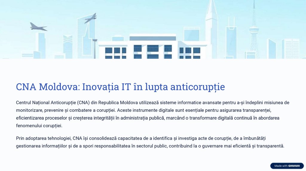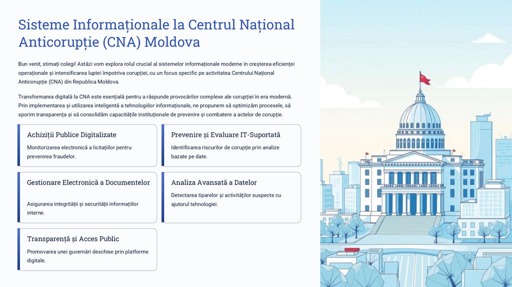 CNA Moldova: Inovația IT în lupta anticorupțieCentrul Național Anticorupție (CNA) din Republica Moldova utilizează sisteme informatice avansate pentru a-și îndeplini misiunea de