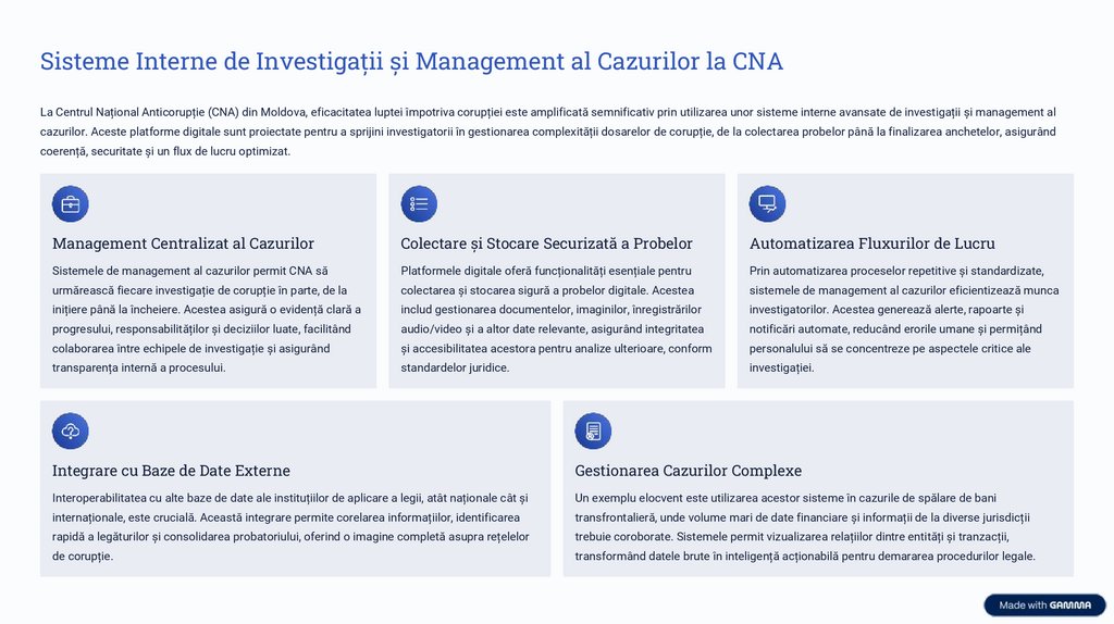 cazurilor. Aceste platforme digitale sunt proiectate pentru a sprijini investigatorii în gestionarea complexității dosarelor de corupție, de la colectarea probelor până la finalizarea anchetelor, asigurând