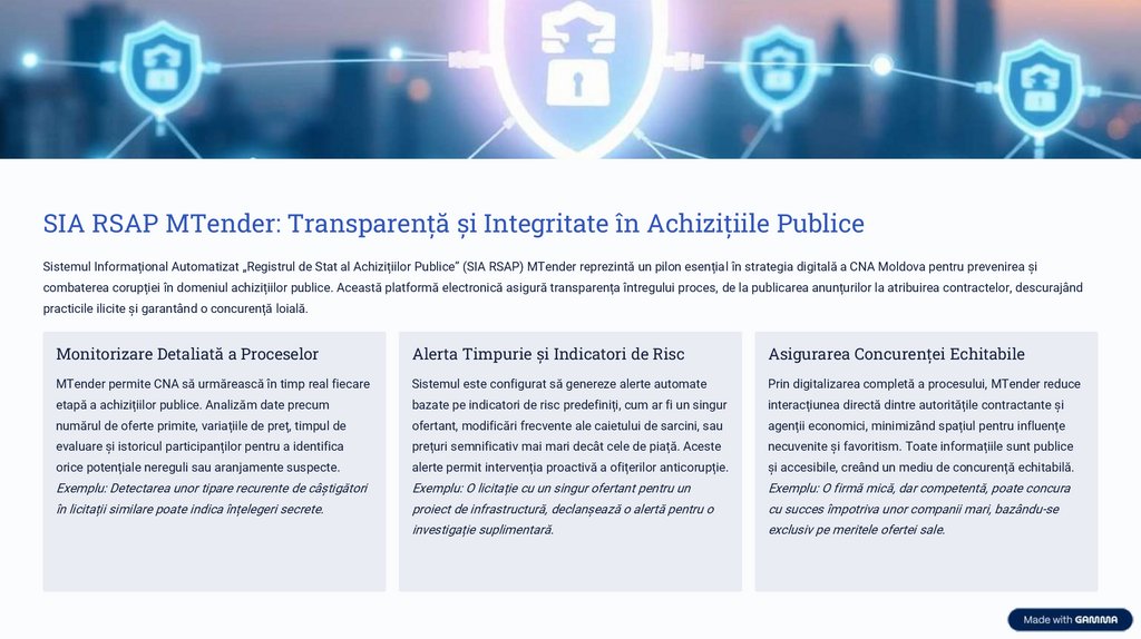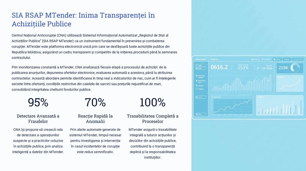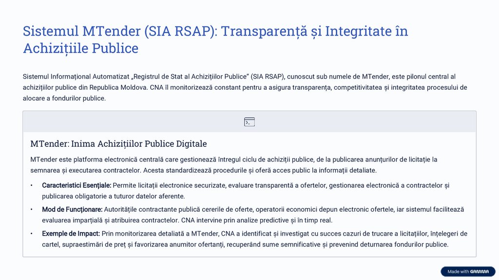 SIA RSAP MTender: Transparență și Integritate în Achizițiile PubliceSistemul Informațional Automatizat „Registrul de Stat al Achizițiilor Publice” (SIA RSAP) MTender reprezintă un pilon esențial în strategia digitală a CNA Moldova pentru prevenirea și