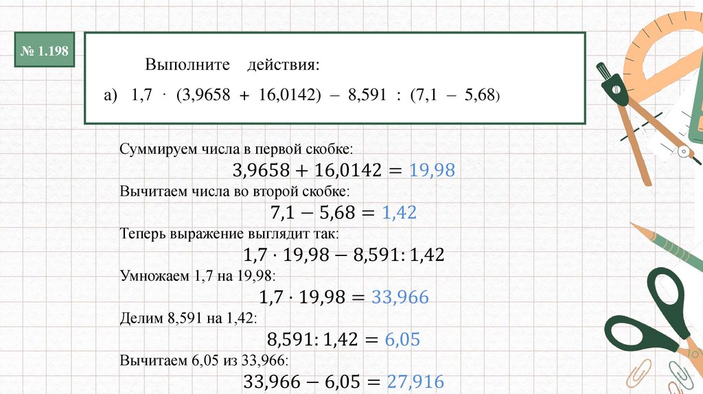 а) 1,7 · (3,9658 + 16,0142) – 8,591 : (7,1 – 5,68)